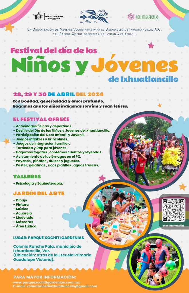 Es por ello que cada año, en la Asociación Civil, hacemos extensiva la invitación para que el 28, 29 y 30 de abril 2024, celebremos juntos en comunidad el Festival del Día de los Niños y Jóvenes de Ixhuatlancillo, el Festival (FDNyJI24) es un evento que ofrece actividades lúdicas y recreativas para los niños y jóvenes del municipio de Ixhuatlancillo y de la zona de las Altas Montañas en el estado de Veracruz.